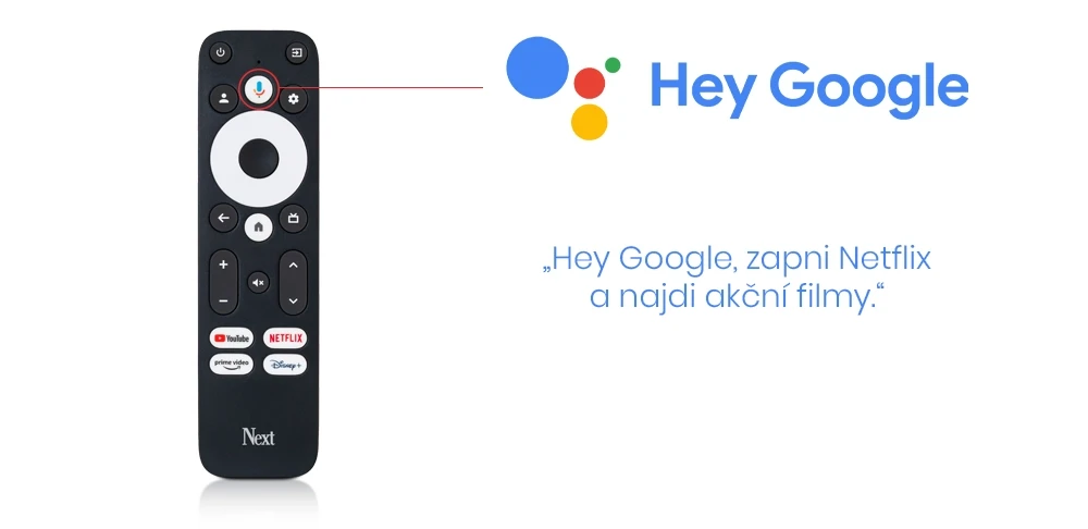 Součástí je také inteligentní dálkový ovladač s mikrofonem, který podporuje Google Assistant. Stačí vyslovit příkaz – najít film, spustit hudbu nebo zjistit předpověď počasí – a systém to udělá za vás.