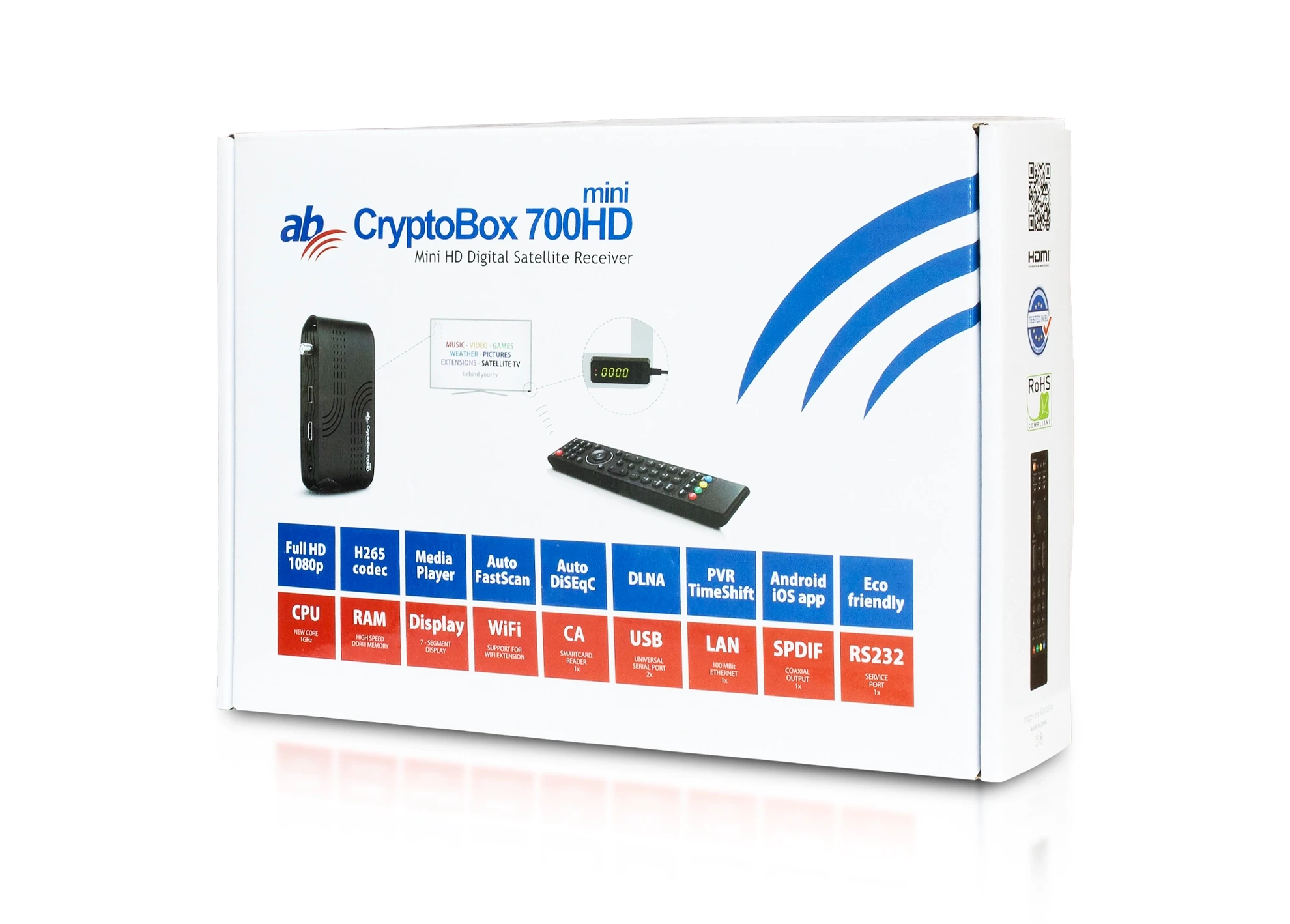 Satelitný prijímač AB CryptoBox v prevedení MINI vylepšený o najnovší kodek H.265 HEVC a s ešte výkonnejším hardwarom.. Kombinácia digitálneho satelitného prijímača a multimediálneho prehrávača v plnom Full HD 1080p rozlíšení. Vhodný pre montáž za TV prijímač, alebo v skrytom priestore. Vyvedené IR čidlo s numerickým LED displejom a kontrolkou zapnutia/vypnutia. Prehrávanie multimediálneho videa, obrázkov a hudby. Nahrávanie programov v reálmom čase, jednoduché časové nahrávanie cez EPG sprievodcu, alebo TIMESHIFT s časovým posunom v nahrávke. X-tras panel s množstvom funkcií: Hry, FTP Downloader, predpoveď počasia, RSS prehliadač správ a ďalšie. FTP Downloader pre zálohu, obnovu a prenos súborov z USB na FTP alebo z FTP na USB (setting, firmware, video, MP3 ...) Konektory: 2x USB 2.0, HDMI, Analogový Audio/Video výstup JACK 3,5, Optický SPDIF audio výstup, RJ45 konktor LAN, Externé IR čidlo, Externý zdroj 220V/12V. Prijímač obsahuje konzolu na uchytenie. (prilepenie)