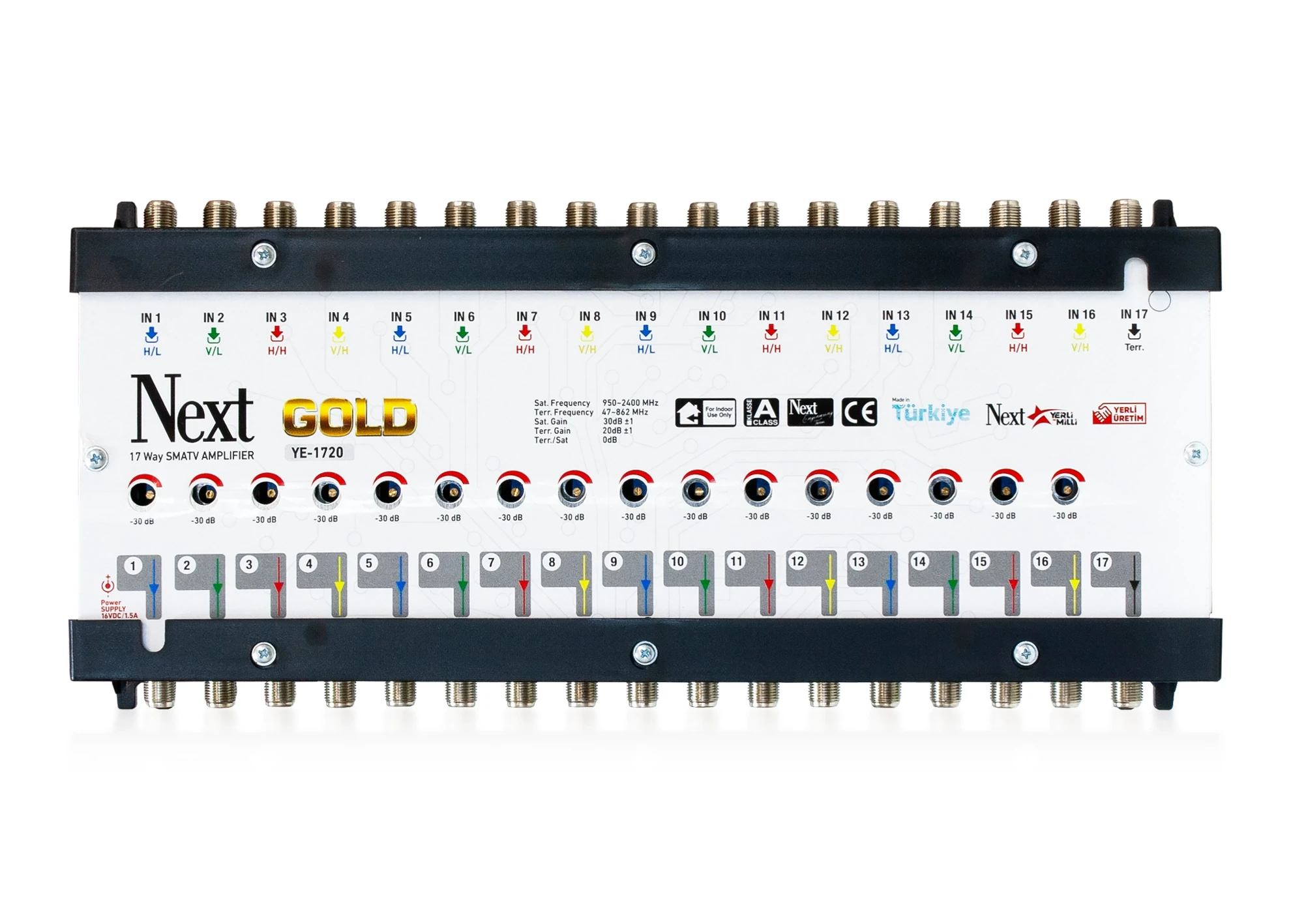 Používá se k zesílení signálů LNB (HL-VL-HH-VH) x 4, (16 x IF).Vysoký zisk (30 dB), nízký šumVysoká izolace mezi vstupy.Pasivní pozemní vstup.Napájení LNB s vypínačem ON/OFF